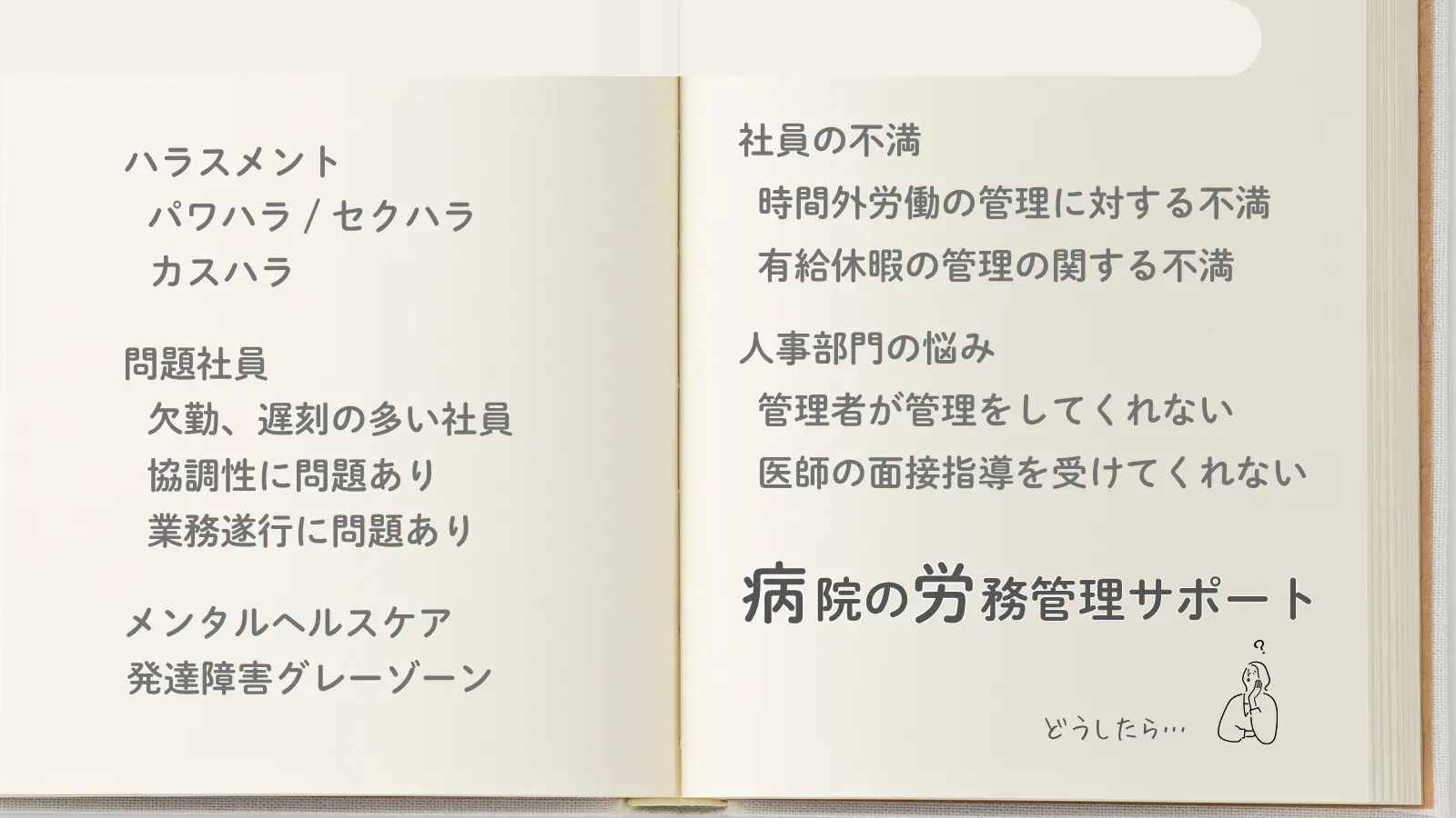 パワハラの訴えが増えている、問題社員の対応で困っている、時間外労働や有給休暇の管理で職員から不満が出ている、さらに医師の働き方改革の対応や始業前残業など、病院の労務問題について解決サポートを行います。